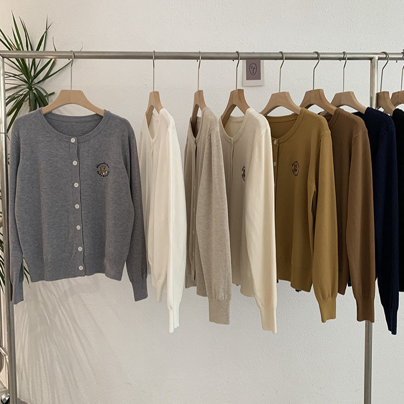This multi-color Bear Embroidery Knitted Cardigan is made of premium knit fabric, soft, breathable, and lightweight yet warm, making it perfect for spring, autumn, and early winter. The round neck design with front button closure ensures easy wear, while the cute bear embroidery on the chest adds a sweet and playful touch.