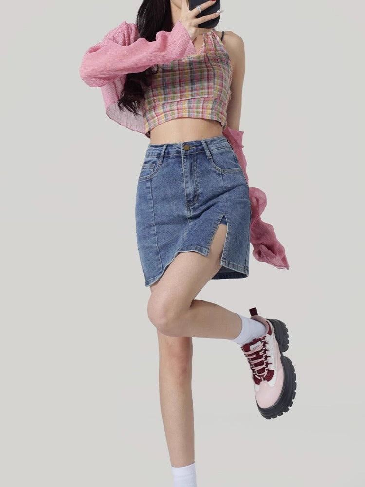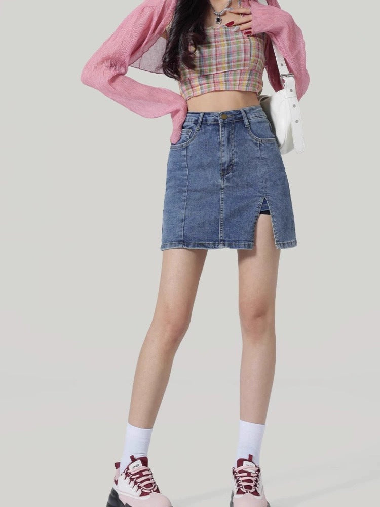 Made with premium cotton denim, the fabric is durable yet breathable, suitable for spring, summer, and fall wear. The skirt includes functional five-pocket styling and a front zip closure with a metallic button, blending practicality with retro charm. Whether paired with a cropped tee or a tucked-in blouse, this skirt is your go-to for daily wear, school looks, or casual outings.