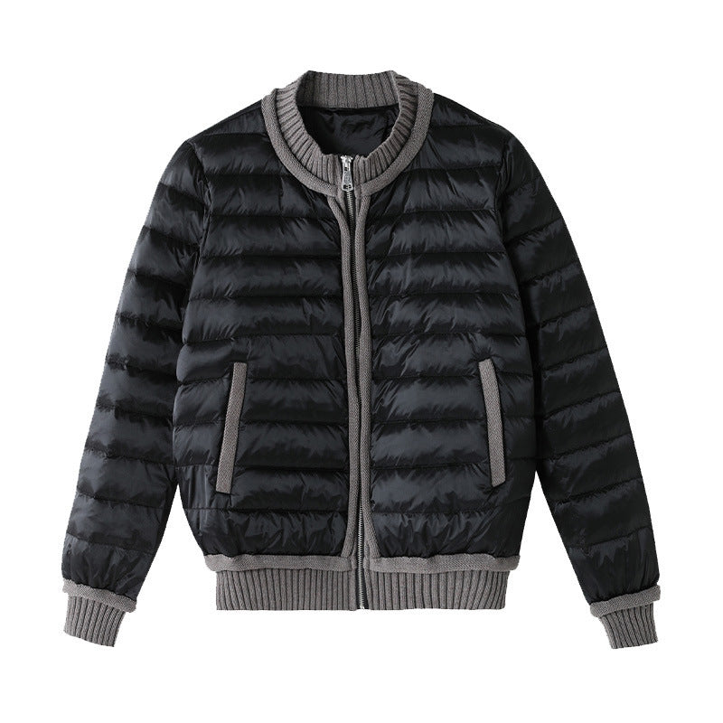The short length design visually elongates the body for a flattering fit. A stand collar provides extra wind protection, while the smooth zipper closure ensures easy wear. The cuffs and hem are finished with elastic knit fabric for added comfort, warmth, and a stylish contrast. Clean quilting lines enhance texture and structure, making this jacket versatile for different occasions.