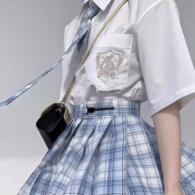This white shirt is made of high-quality polyester-cotton blend fabric, lightweight, breathable, and comfortable for all-day wear. With a clean and classic design, it features a chest pocket decorated with a delicate embroidered crest, adding a touch of elegance and school-style charm. The turn-down collar and button-up closure make it versatile for daily wear, school uniforms, or semi-formal occasions.
